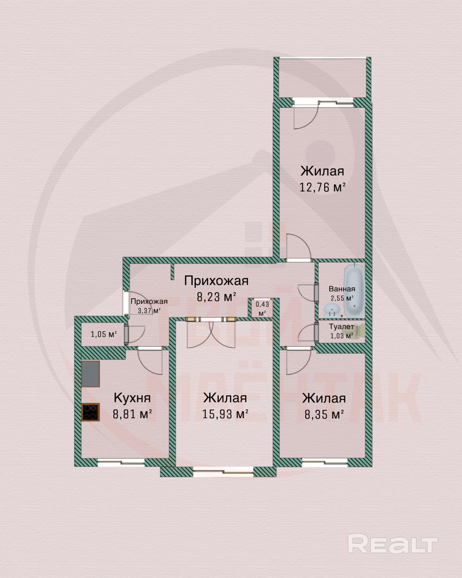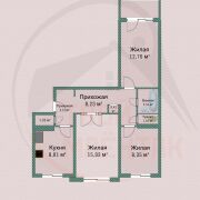 Жилая -37,04 (гостиная-15,93 кв.м, детская- 8,35 кв.м, спальня -12,76 кв.м)