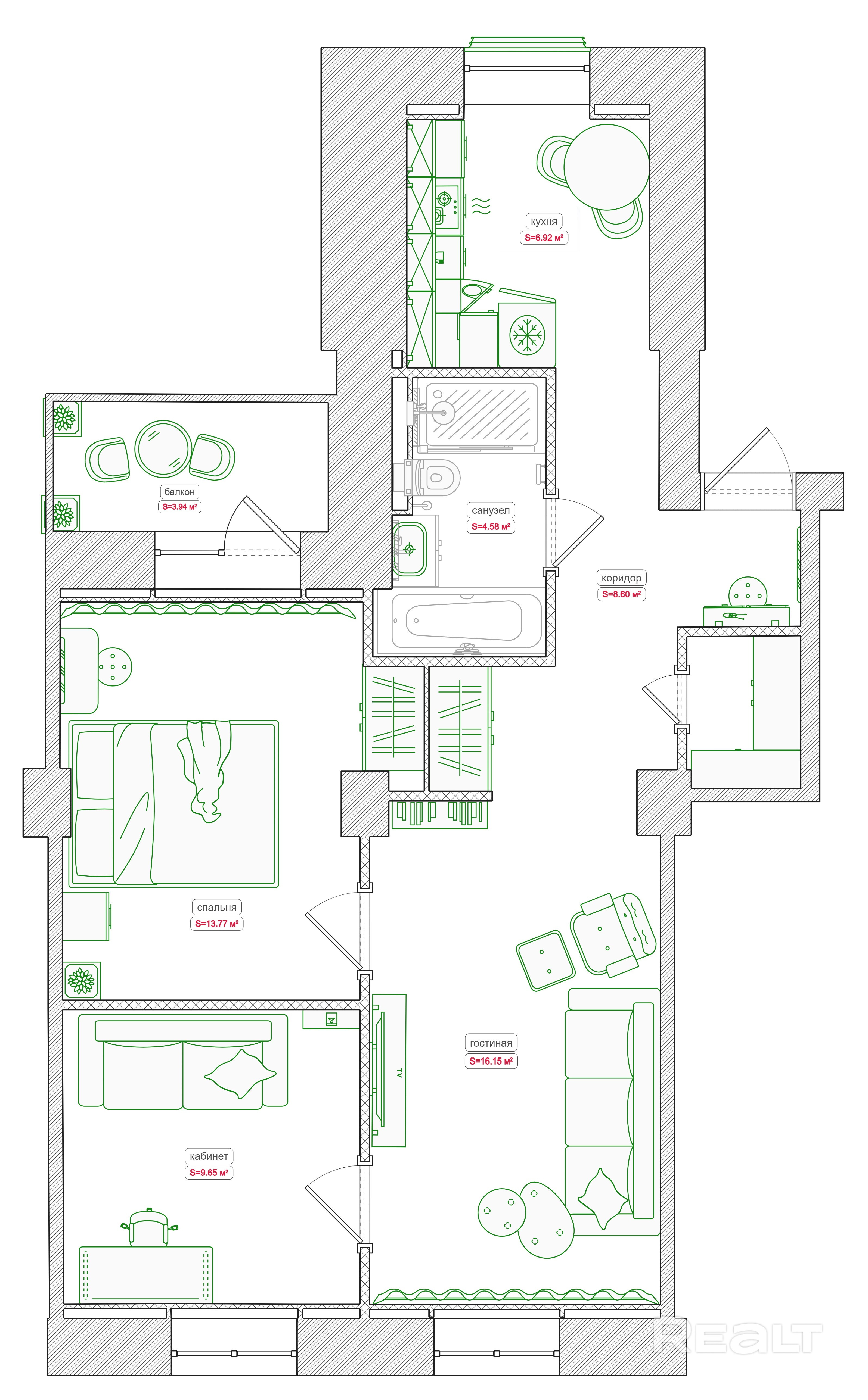 • Зоны комфорта: Просторная гостиная для приемов, уютная спальня и изолированный кабинет — идеальное решение для тех, кто управляет миром, не выходя из дома.