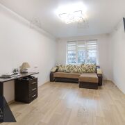 • Потолки: Современные натяжные потолки в комнате и на кухне.