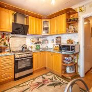 Кухня: площадью 9 м2. Вся кухонная мебель и встроенная техника останется новому владельцу. Кухня угловая, за счет чего имеется большая рабочая зона и зона для приема пищи.