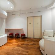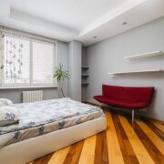 - Жилые комнаты просторные. Есть шкаф купе, дополнительные зоны хранения, подвесные потолки. В одной из комнат размещено эркерное окно. В отделке использованы стильные стеклянные блоки. Установлен кондиционер. Мебель итальянского производства.