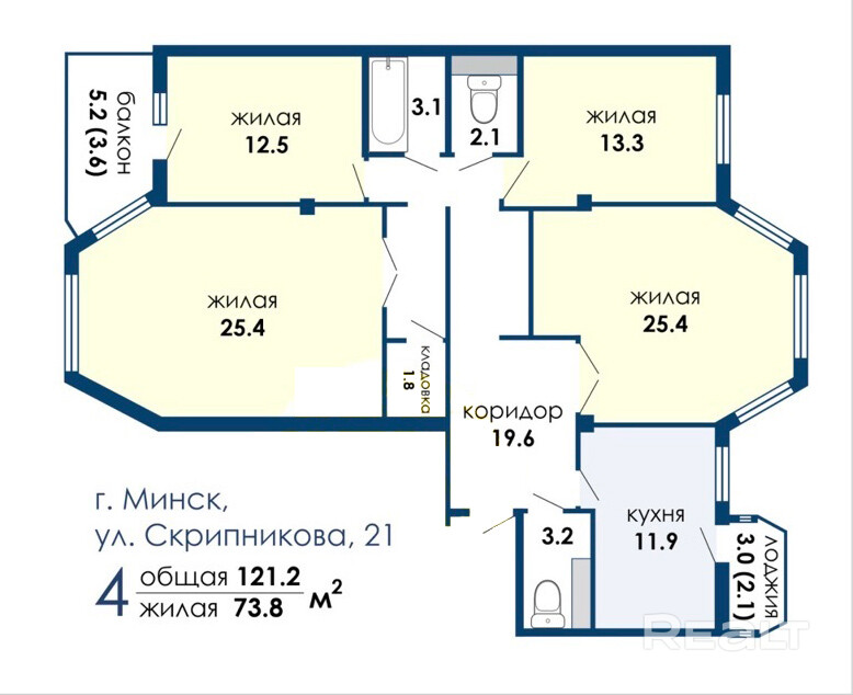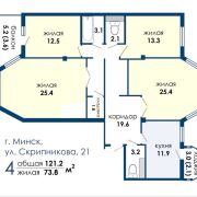 Площадь квартиры по СНБ составляет 121.2 м2.