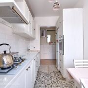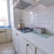 - В кухне на полу и в рабочей зоне уложена плитка – максимальная практичность! Новый кухонный гарнитур в комплекте со встроенной техникой.