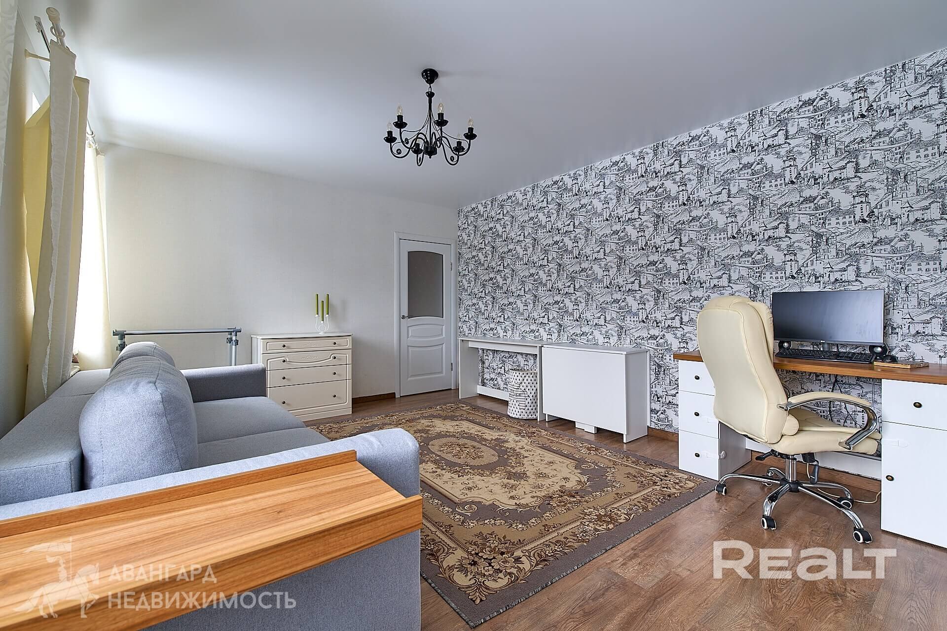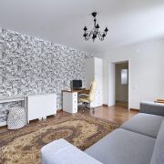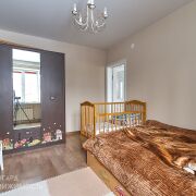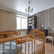 - В жилых комнатах и в коридоре на полу уложен ламинат, стены оклеены обоями, потолки натяжные.