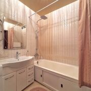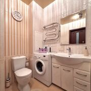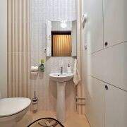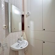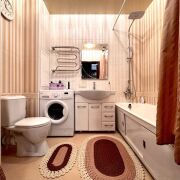 Санузел и ванная комната облицованы современной плиткой, предусмотрены удобные зоны хранения, установлена импортная сантехника. Напольные покрытия: ламинат в комнатах и прихожей, линолеум на кухне. Потолки выровнены и окрашены.