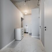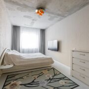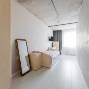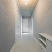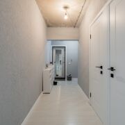 На полу плитка и уложен ламинат 34 класса. На стенах фактурная декоративная штукатурка. Межкомнатные двери МДФ.