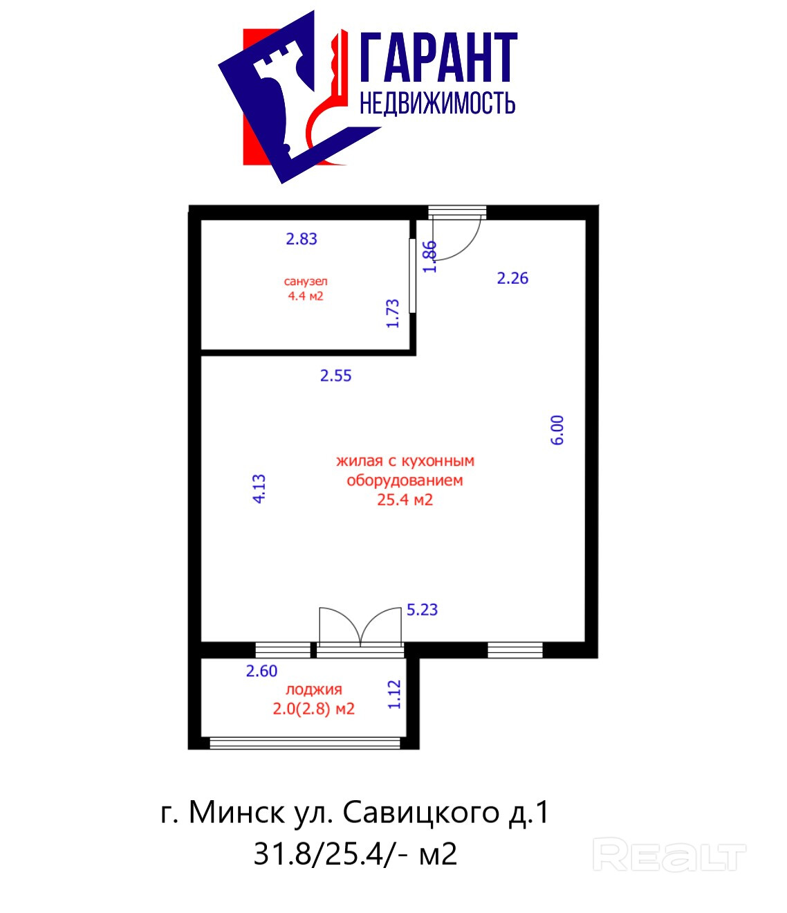 Общая площадь квартиры по СНБ составляет 31.8 м2. Жилая площадь 25.4 м2. Площадь лоджии 2.8 м2.