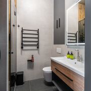 На полу керамогранит и влагозащитный, износостойкий ламинат.