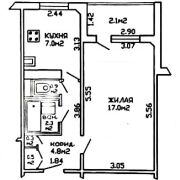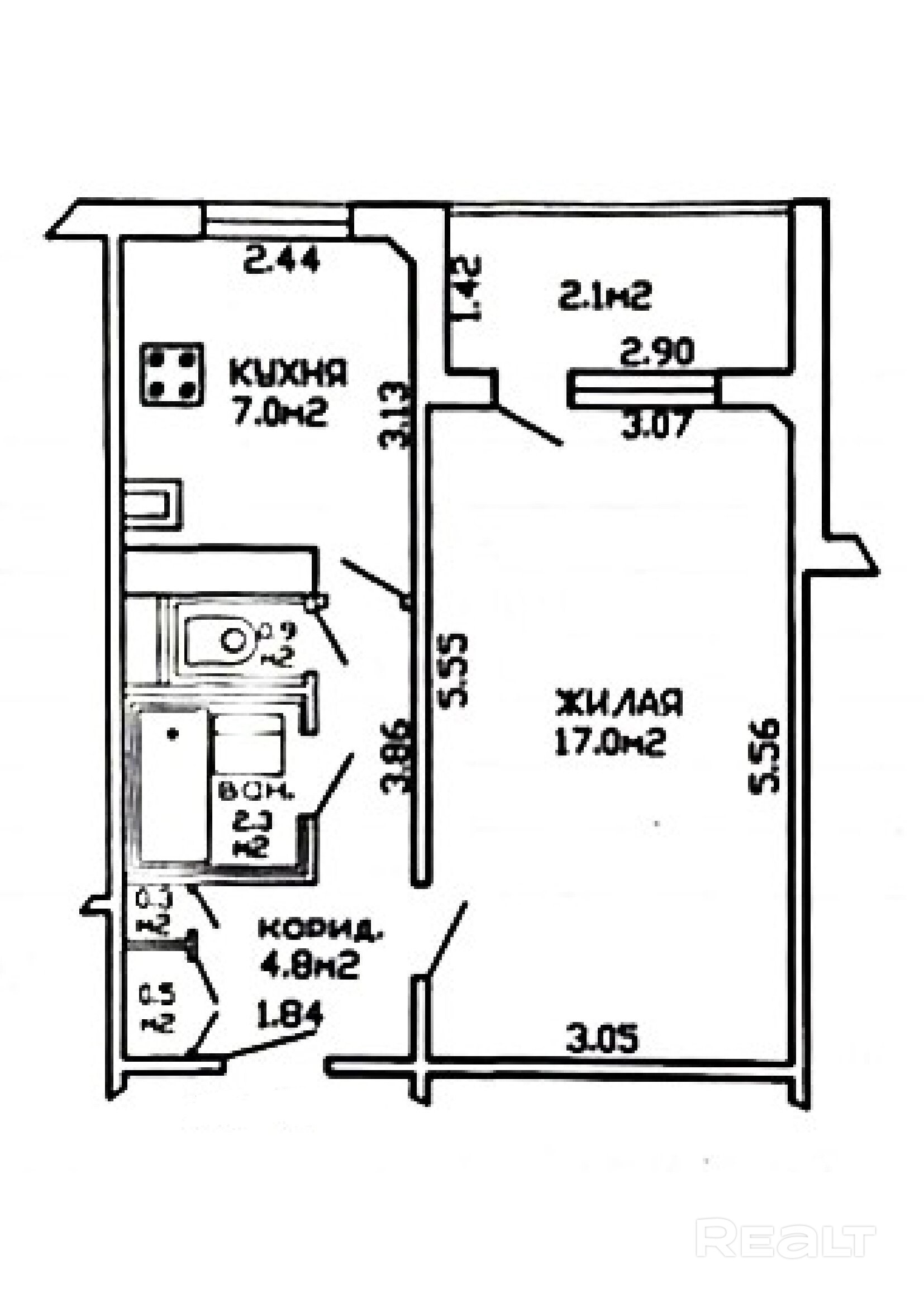 Площадь общая в объявлении указана по СНБ (Площадь по СНБ 34.9 м2, общая – 32.8 м2, жилая комната – 17 м2, кухня – 7 м2)
