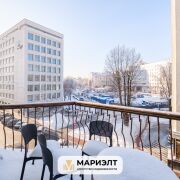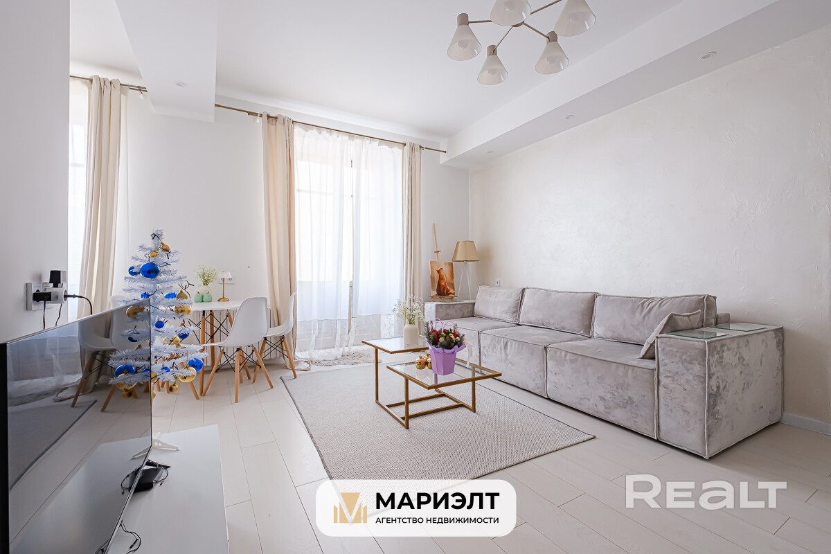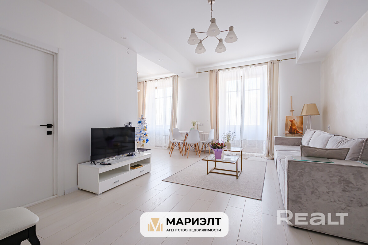 Продается элитная 2-комнатная квартира с премиум-ремонтом в сердце Минска — ул. Ленинградская, 1. Часть легендарного комплекса «Ворота Минска»: кирпичный дом после капремонта, 4 этаж, потолки 3,07 м, панорамный вид на исторический центр, просторный балкон и согласованная перепланировка.