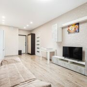 - В квартире выполнен стильный ремонт с применением исключительно качественных отделочных материалов. На полу уложен ламинат 33 класса, стены оклеены обоями в нейтральной цветовой гамме. Потолки - натяжные белого цвета, которые визуально увеличивают высоту помещения. На входе стоит прочная металлическая дверь