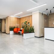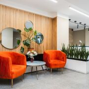 -Уютное лобби оформлено в теплых тонах с использованием натуральных материалов. Здесь находится стойка консьержа и туалетная комната с пеленальным столиком.