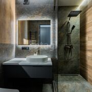 • подсветка в зоне душа и скрытые секции для ванных принадлежностей.