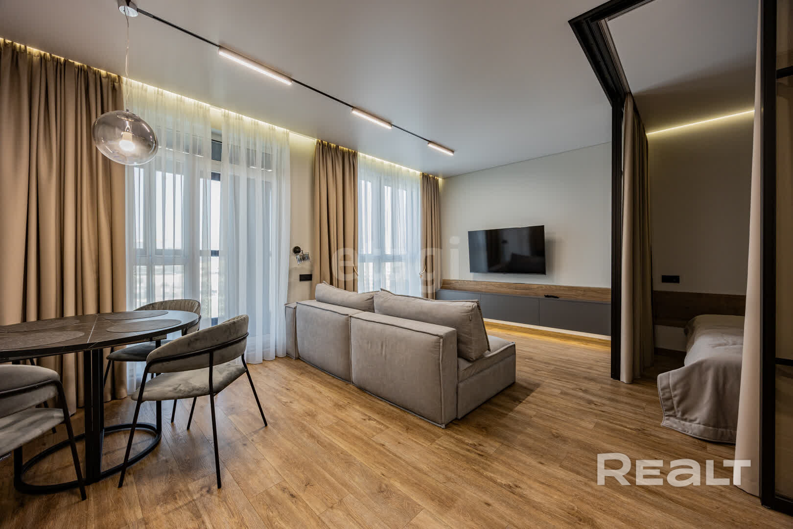 парящие матовые натяжные потолки с подсветкой зоны штор, спального места, в санузле — подсветка душа.