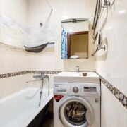 - Санузел раздельный. Ванная комната облицована плиткой в светлой гамме с декоративными акцентами. Установлены ванна, раковина с местом для стиральной машины. Сантехника и полотенцесушитель в хорошем состоянии. Санузел оформлен в едином стиле с ванной.