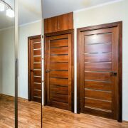 - Прихожая сразу создаёт ощущение порядка: износостойкое напольное покрытие под дерево, спокойная отделка стен, вместительный шкаф с зеркальными фасадами, который визуально расширяет пространство и решает вопрос хранения. Межкомнатные двери выдержаны в едином стиле, с качественной фурнитурой.