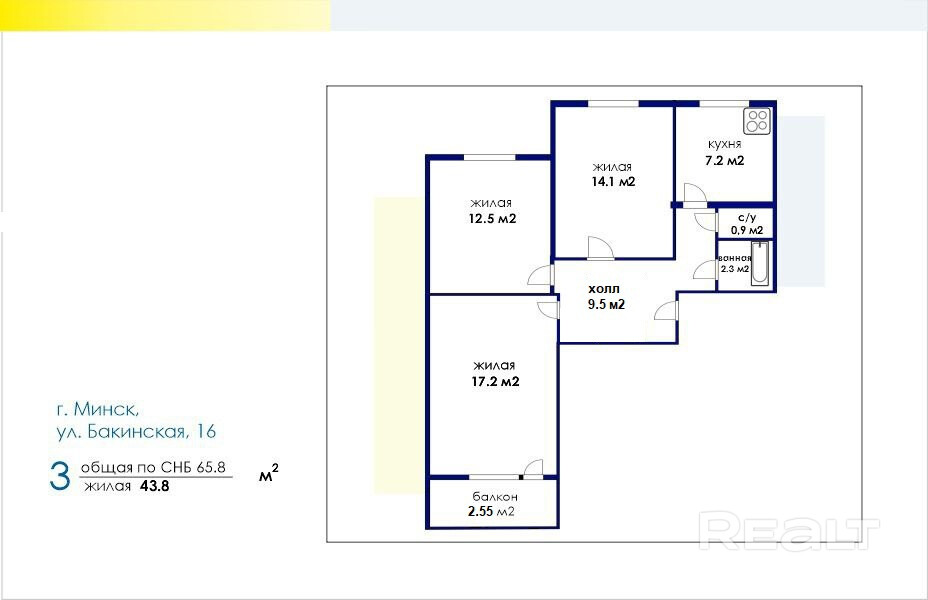 Все комнаты раздельные: 17,2 / 14,1 / 12,5 м2