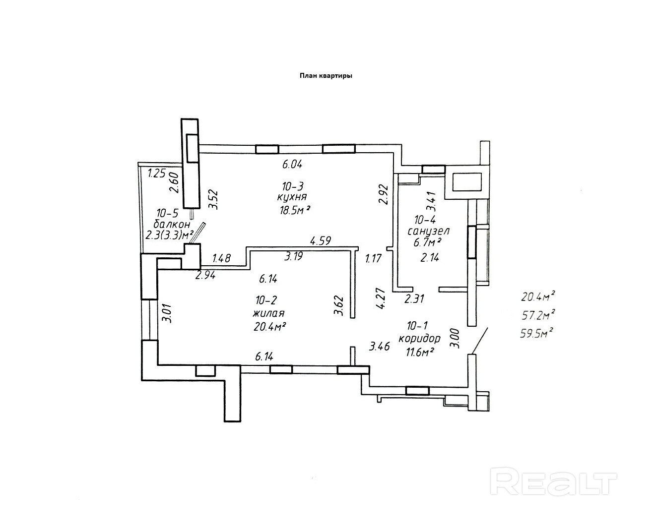- Общая площадь по СНБ — 59,5 м2