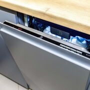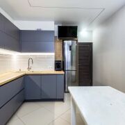 - Кухня оформлена лаконично и функционально: матовые фасады глубокого серого оттенка сочетаются с тёплой столешницей под дерево, создавая баланс строгости и уюта. Рабочая зона выложена белой плиткой с аккуратной геометрией, установлена встроенная техника, продумано подсветка – готовить и проводить время здесь удобно в любое время суток. Обеденная зона логично вписана в пространство и не перегружает интерьер.