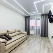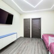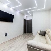 - Комнаты светлые и просторные с ровными стенами в спокойной гамме, на полу уложен ламинат премиум класса. Потолки с дизайнерскими LED-подсветками задают мягкий сценарий освещения. Комнаты выглядит лёгкими, «воздушными» и располагают к отдыху.