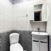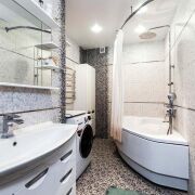 - Санузлы выполнены на высоком уровне. В ванной использована современная плитка с мелкой мозаикой, установлена угловая ванна, мебель с системой хранения и место под стиральную машину. Сантехника современная и качественная.