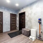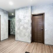 - Прихожая поддерживает общую концепцию квартиры: качественное напольное покрытие, современные межкомнатные двери в едином дизайне, спокойные текстуры стен, металлическая входная дверь.