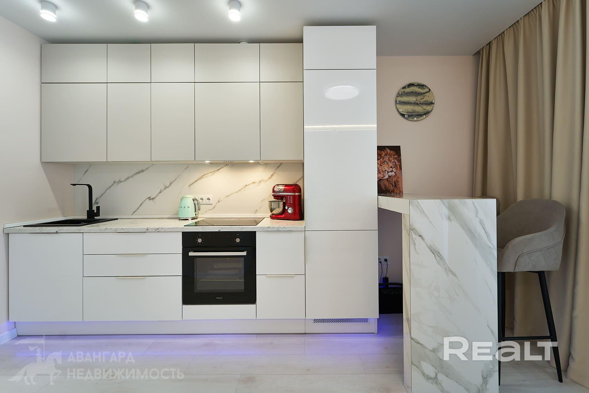 Просторная однокомнатная квартира с отдельной гардеробной комнатой в ЖК «Минск Мир» дом Лас Вегас квартал Северная Америка. Общая площадь 30.9м2 на видовом 22-ом этаже 25-этажного каркасно-блочного дома 2021 г. п. Высота помещений- 2.72 м