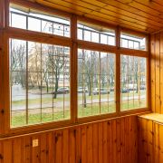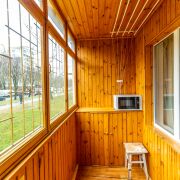 Лоджия застеклена и отделана вагонкой, что делает ее уютной. Дополнительным бонусом является наличие подвала под лоджией, что позволяет хранить резину, закатки и прочее.
