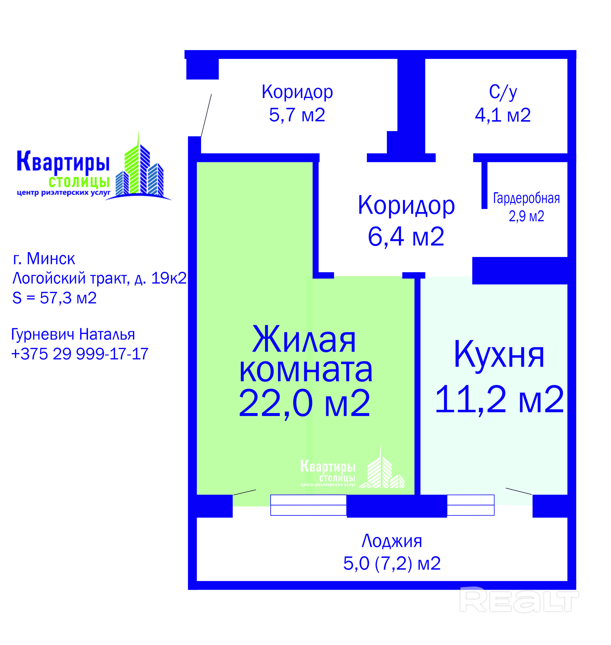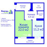 Метраж квартиры: общ. 57.3м2, жил. 22м2, кухня 11.2 м2