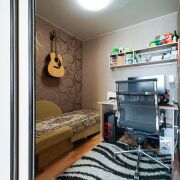 Жилая комната: пространство, площадью 22м2, правильной формы. Площадь позволила визуально зонировать комнату перегородкой и расположить две зоны: детская, с рабочим и спальным местом, а также место для отдыха. Имеется выход на лоджию.