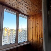 -Застеклённая лоджия, обшитая вагонкой, - это ещё одно уютное место, где можно устроить зону отдыха или мини-кабинет.