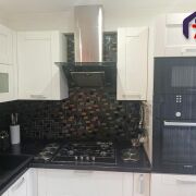 -Большая кухня площадью 8,3 кв.м. станет сердцем квартиры: здесь установлен удобный дубовый кухонный гарнитур, на полу - практичная современная плитка, вся техника фирмы Bosh, стиральная машина спрятана в гарнитуре.