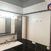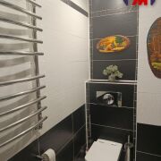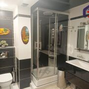 -Санузел совместный, облицован плиткой, установлена современная душевая кабина с сауной, унитаз с современной системой Инсталляция. Навесные шкафчики под большой комфортной раковиной, зеркало с подсветкой.