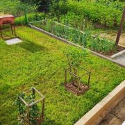 -Под окнами оборудована личная мангальная зона со столом и скамейками, где так же в подарок остаётся мангал. Достаточно места и для маленького огорода.