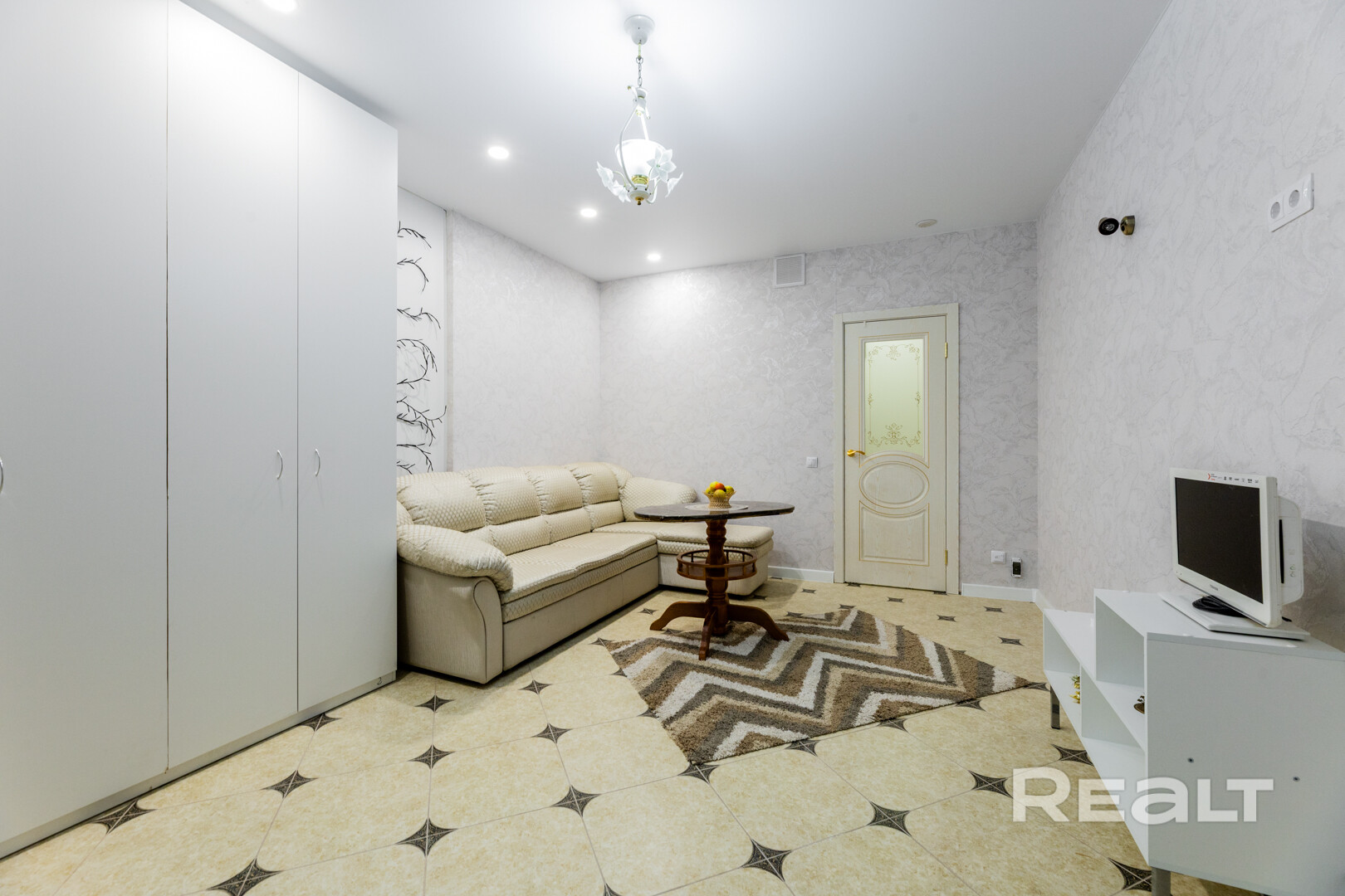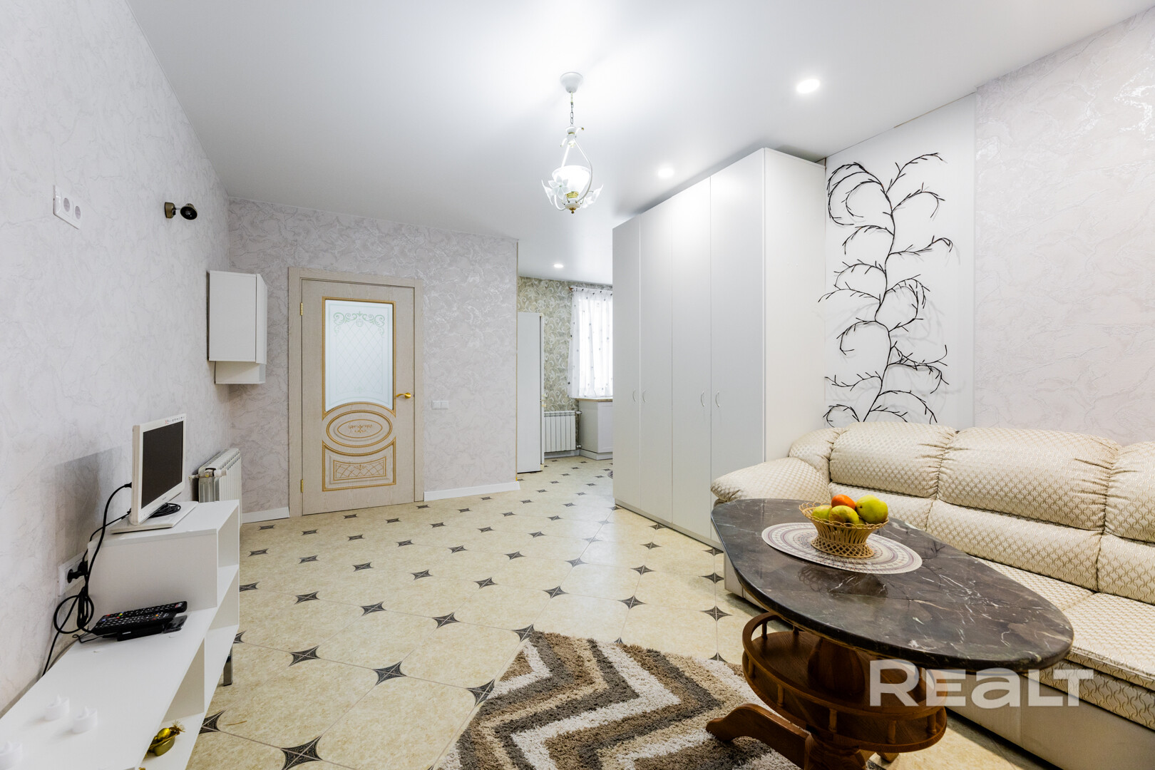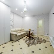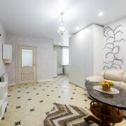 По периметру всей квартиры на полу качественная плитка и деревянный подиум в пространстве спальни. Натяжные потолки с продуманной системой освещения комнат придают уют и, в то же время, достаточное количество света.
