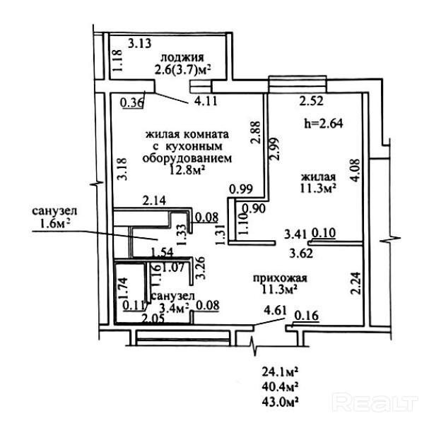 Потолки в квартире 2,64. Общая площадь по СНБ – 43 кв.м.