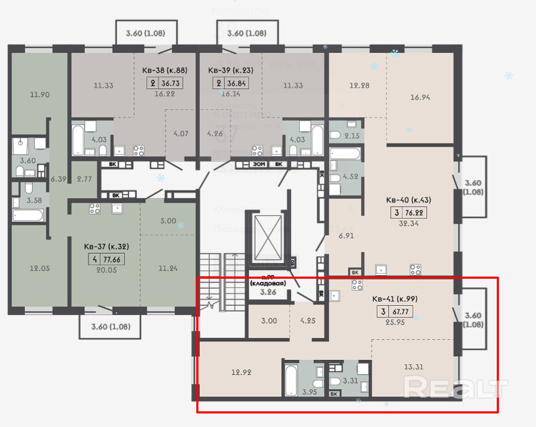 Для каждой квартиры – кладовая в тех. подполье, для некоторых квартир есть кладовые на этаже в угловой секции.