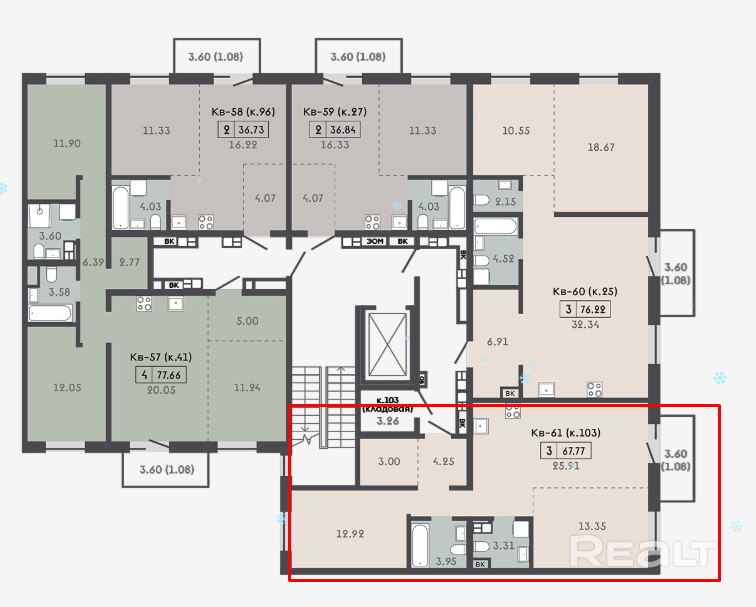 Для каждой квартиры – кладовая в тех. подполье, для некоторых квартир есть кладовые на этаже в угловой секции.