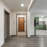 - Уникальное расположение дома: дом стоит вдоль дороги, но квартира находится в перпендикулярном подъезде с окнами на тихую, зелёную зону. Полная звукоизоляция от магистрали.