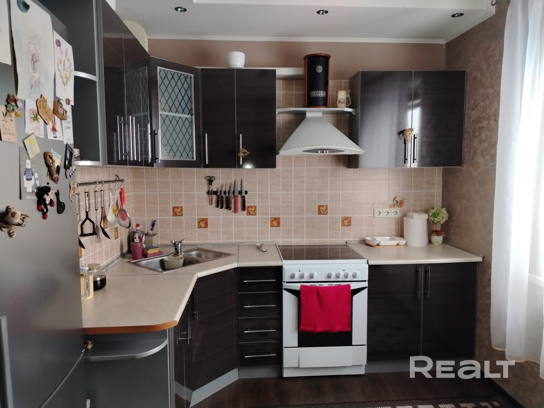 Кухня оборудована необходимой техникой: электроплита с духовым шкафом, холодильник. Предусмотрено достаточное количество мест для хранения,размещается обеденная группа со столом для всей семьи.Высота потолков 2,65 м.