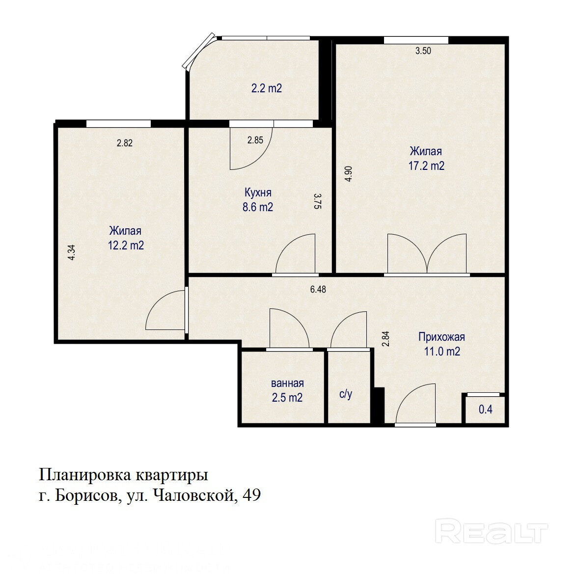 -жилые комнаты: 17,2м кв. и 12,2 м кв.,