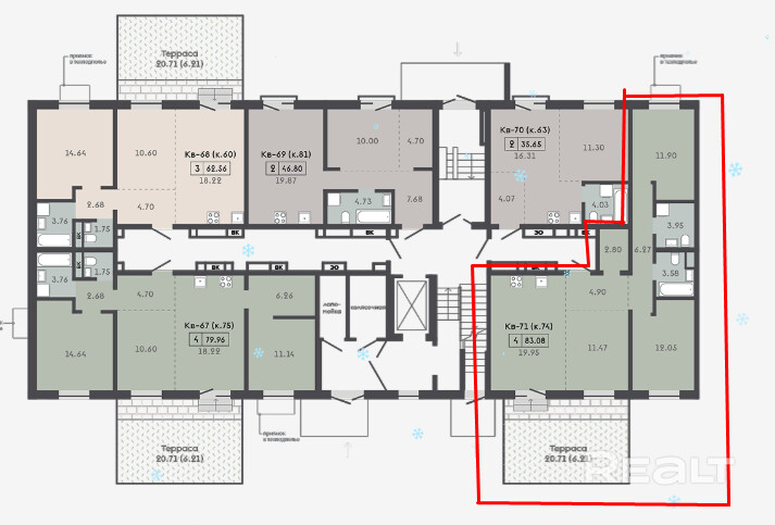 Квартиры на 1 этаже с личными участками-террасами с видом во двор и зеленый коридор.