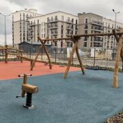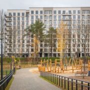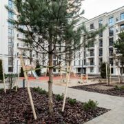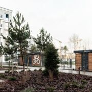 Приватный двор без автомобилей украшает ландшафтный дизайн, есть развивающая детская игровая зона, зона барбекю и закрытая велопарковка. Рядом находится плоскостная парковка с возможностью установки зарядок для электромобилей, а в шаговой доступности — многоуровневый паркинг.