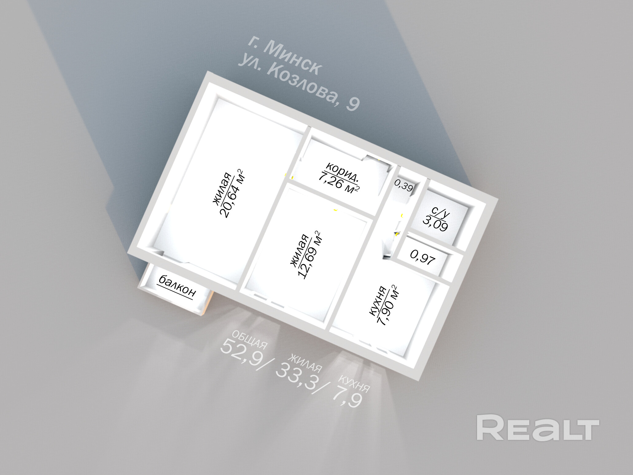 - Площадь: 52,94 м2 общая, 33,33 м2 жилая, 7,90 м2 кухня