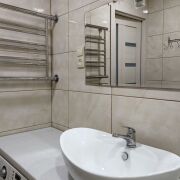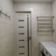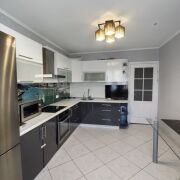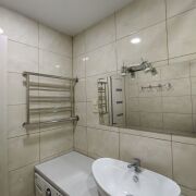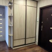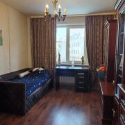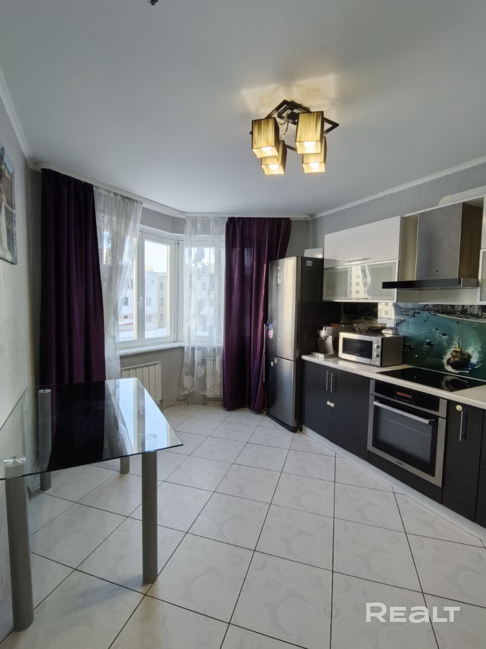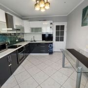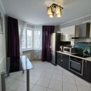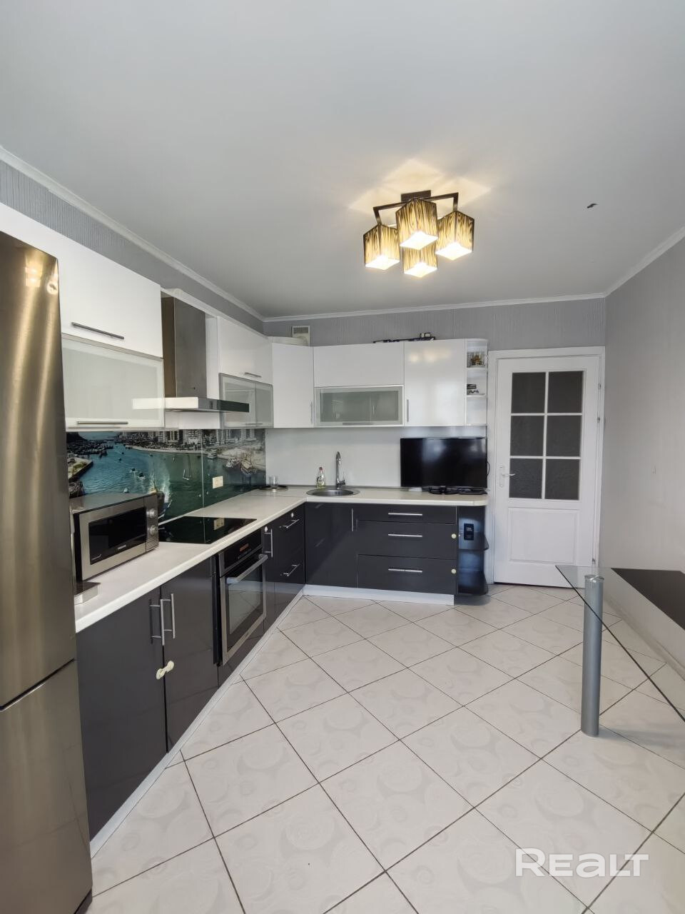 В квартире выполнен современный ремонт: на полу уложен ламинат и плитка, кухне оснащена встроенным кухонным гарнитуром и бытовой техникой — духовым шкафом, варочной панелью, вытяжкой и холодильником. В коридоре и комнатах установлены встроенные шкафы. В санузле и ванной комнате уложена новая облицовочная плитка, сантехника обновлена.