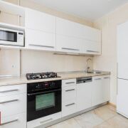 Уютная стильная кухня со встроенной техникой: духовым шкафом и посудомоечной машиной. У верхних шкафчиков вертикальное открытие на блюмовских доводчиках. На полу кухни - итальянская плитка с подогревом.