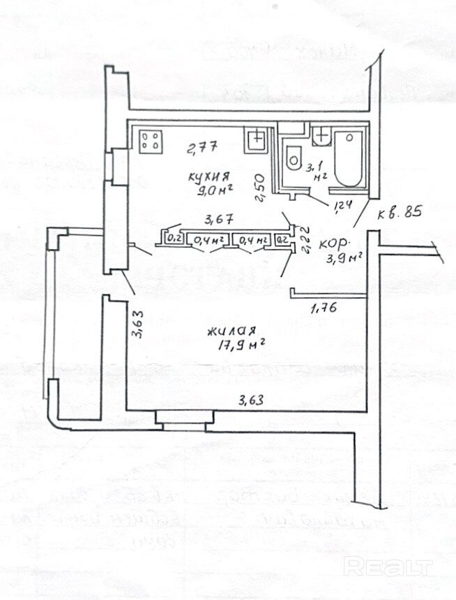 Площадь квартиры 35.1 м. кВ., большая кухня 9 м. кв., жилая комната 17.9 м. кв., окна выходят на две стороны дома. Из окон открывается красивый вид на лесо-парковую зону.