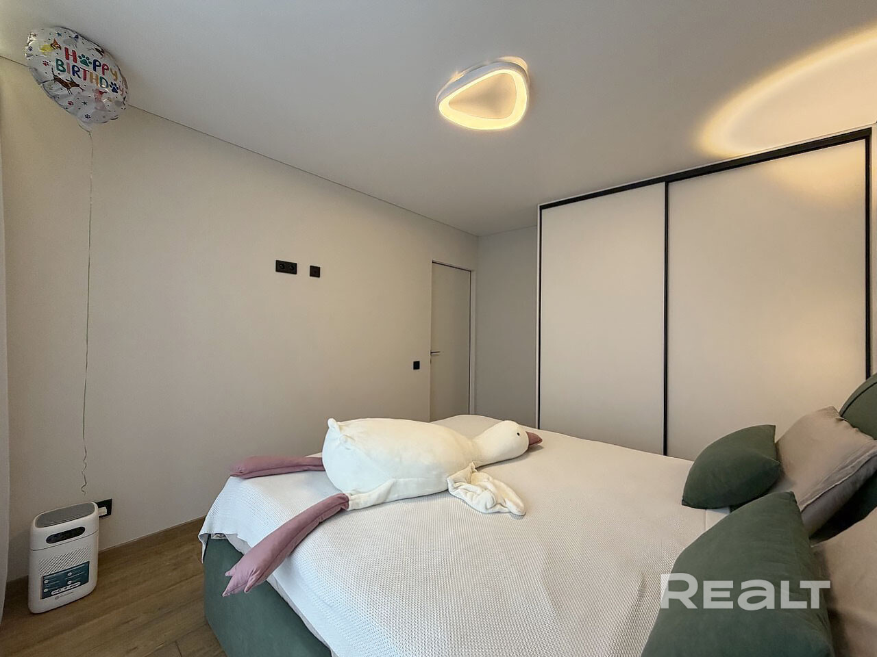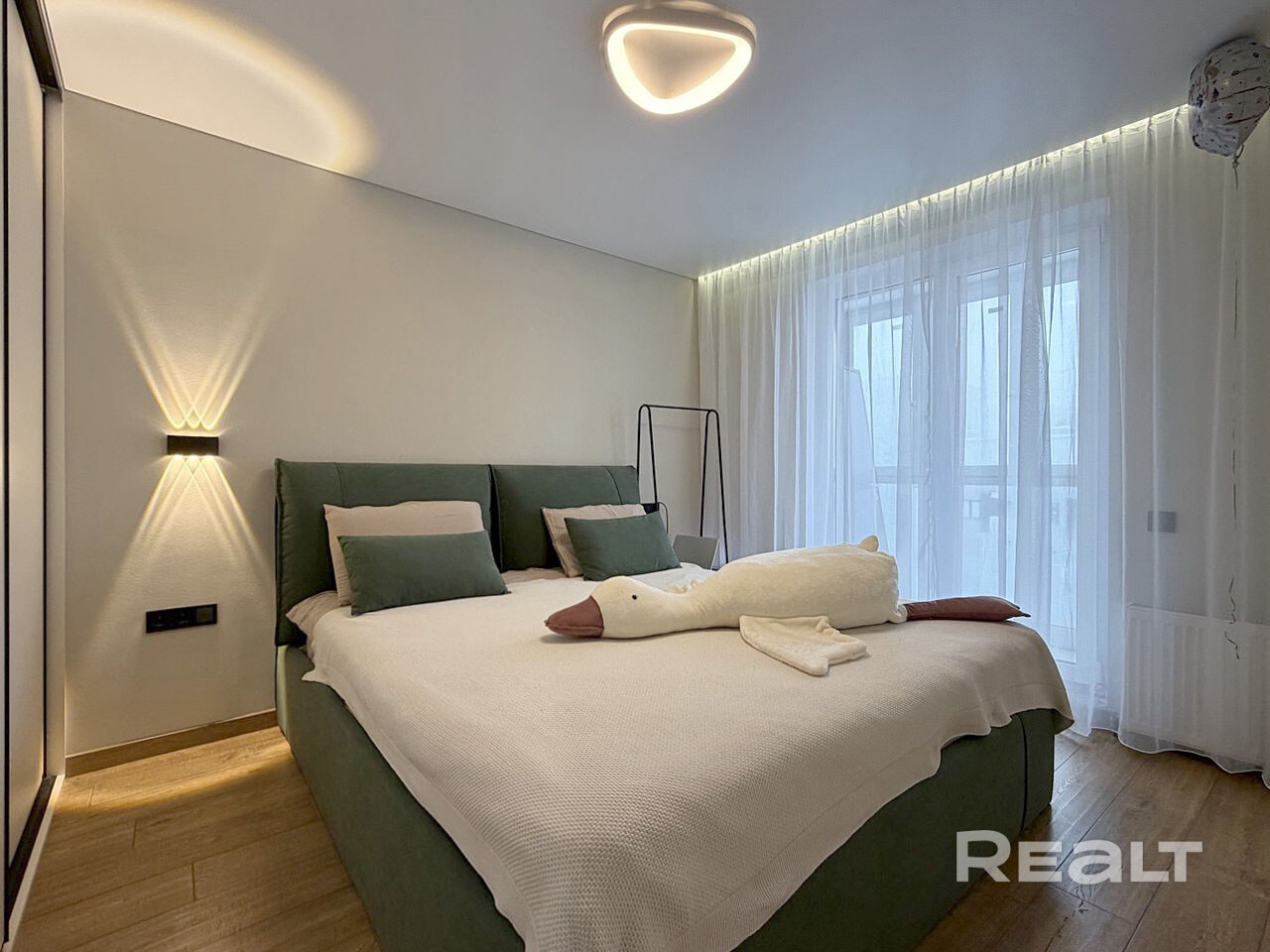 Спальня оснащена кроватью со подъёмным механизмом и встроенным шкафом купе.