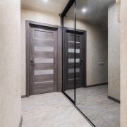 -В квартире выполнен евроремонт. Входная металлическая дверь даёт ощущение надёжности с порога. В коридоре установлен встроенный шкаф-купе, который полностью закрывает вопрос хранения. На полу плитка - практичное решение для входной зоны, стены оклеены обоями, потолок оформлен панелями, всё выглядит аккуратно и функционально.