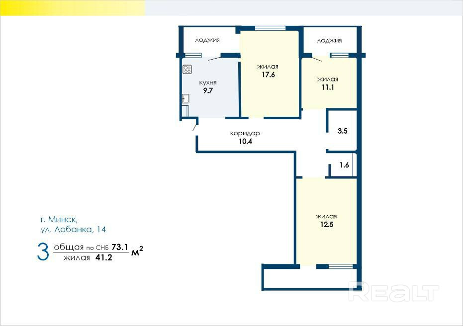 Уникальная планировка: в квартире 3 лоджии! Из кухни, а также из 2 жилых комнат, просторная ванная комната, раздельный санузел, комнаты правильной формы (17.6, 11.1, 12.5 м2).